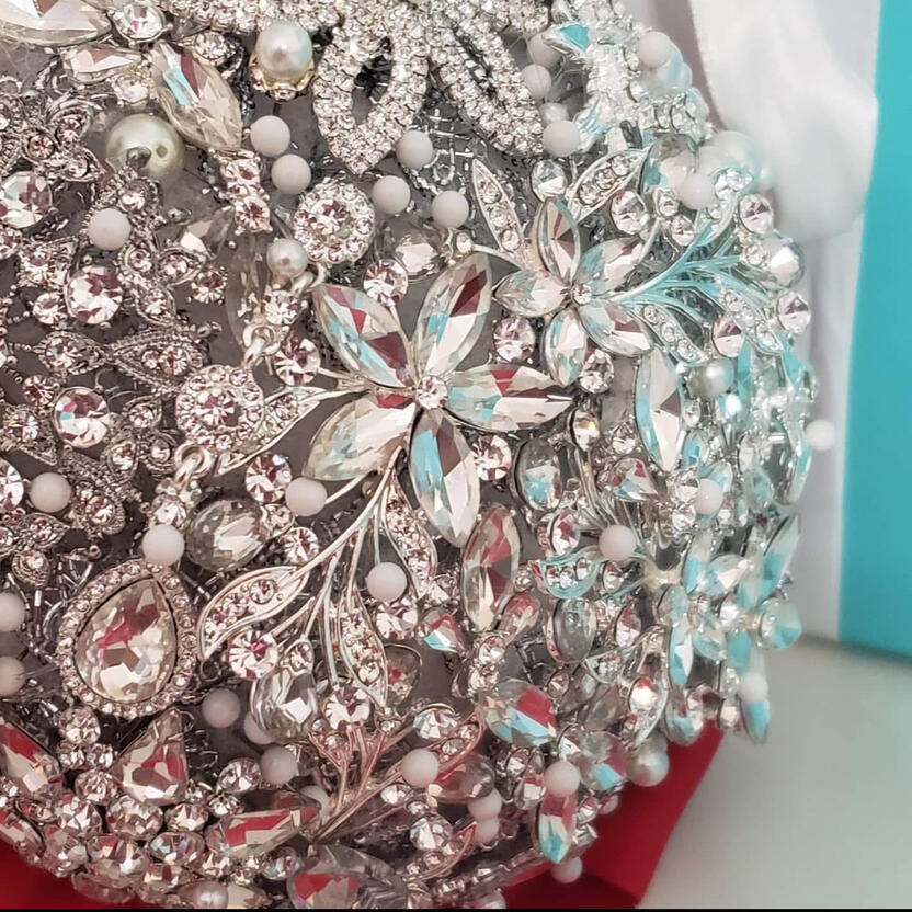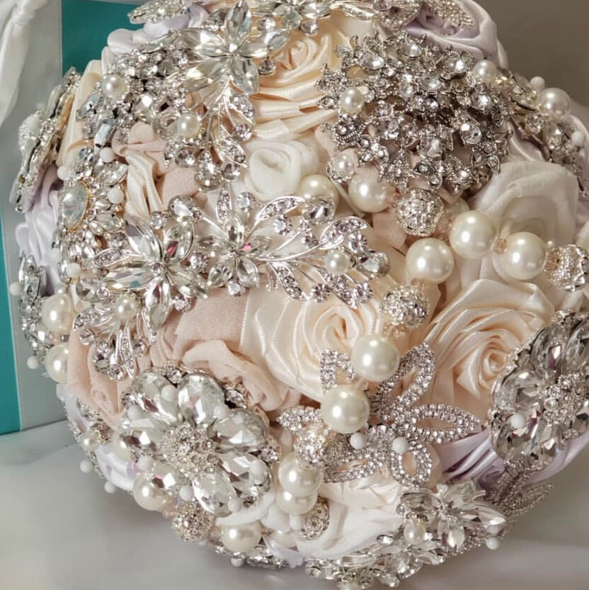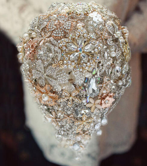 Custom designed couture bouquets with Swarovski crystals, heirloom brooches, and luxurious satin .